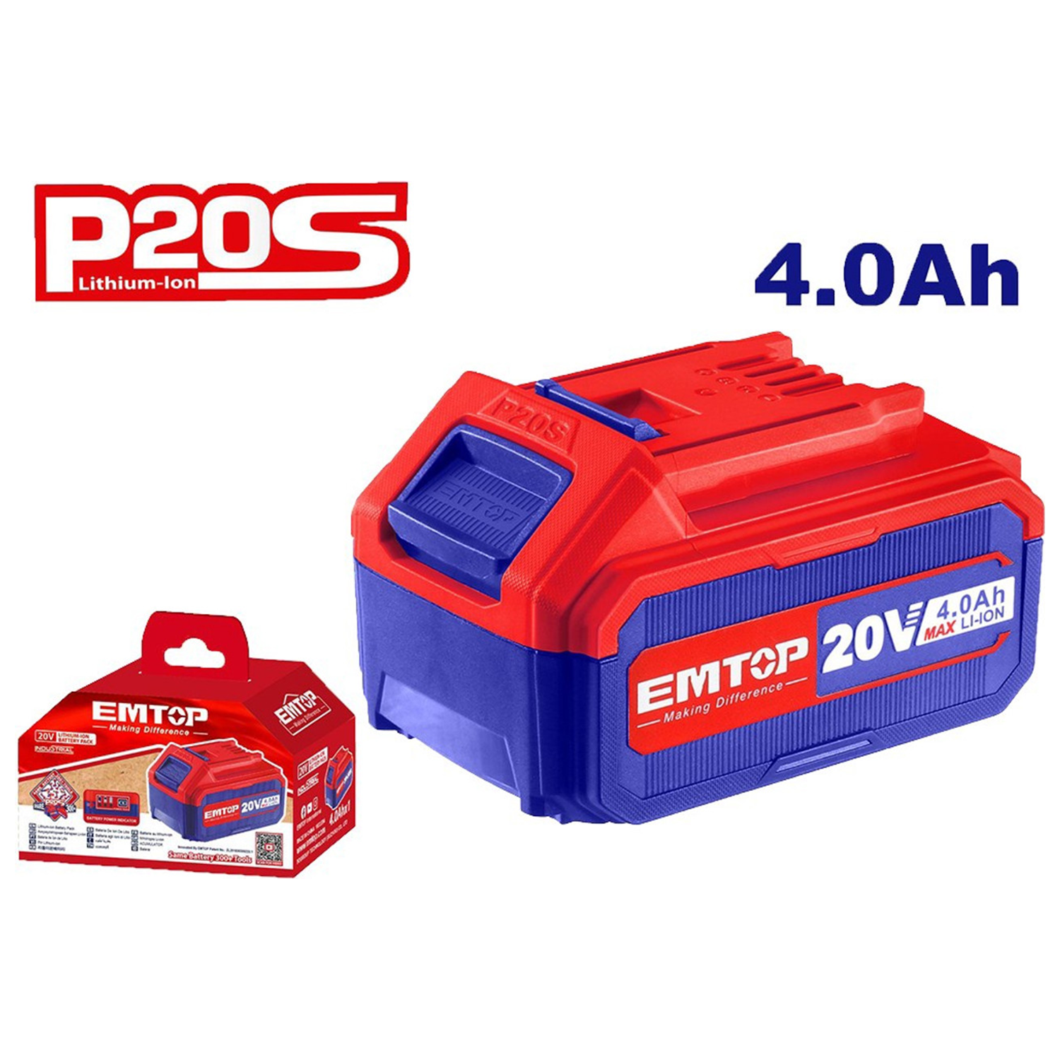 Emtop Lithium Battery, 20V, 4Ah, LED Indicator, EBPK20021